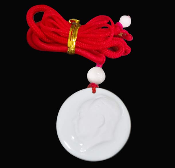 毛澤東主席浮雕瓷像徽章以紅色雕塑家張松鶴1965年創(chuàng)作的毛澤東主席浮雕瓷像為母版,經(jīng)微縮浮雕后采用高溫施釉與素?zé)嘟Y(jié)合的方法,選用當(dāng)年制作毛澤東主席生活用瓷的珍貴原料“大球泥”精制而成。
