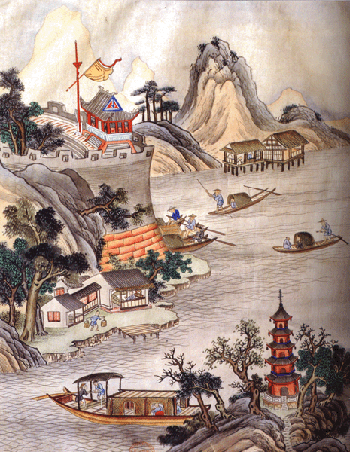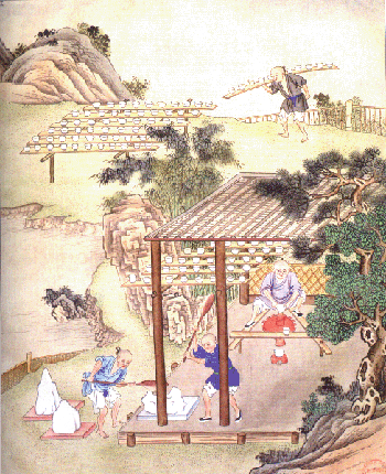 設計→脫稿→整理→復稿→磨墨→勾線→調色→分水→點染→皴擦→勾花筋→點花芯→畫鳥(蟲草)→加底標→清色→下位