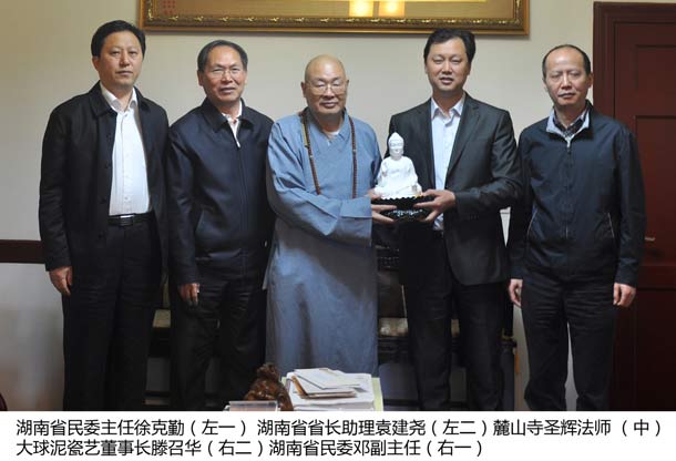 2014年11月5日上午10時(shí)許,在湖南省省長助理袁建堯、湖南省民委主任徐克勤等一行的見證下,湖南大球泥瓷藝有限公司董事長滕召華拜訪了中國佛教協(xié)會副會長兼秘書長、湖南佛教協(xié)會會長、麓山寺方丈圣輝法師,并親手將046號《多寶佛》(釋迦牟尼佛瓷塑像)捐贈給圣輝法師、永久收藏于麓山寺。