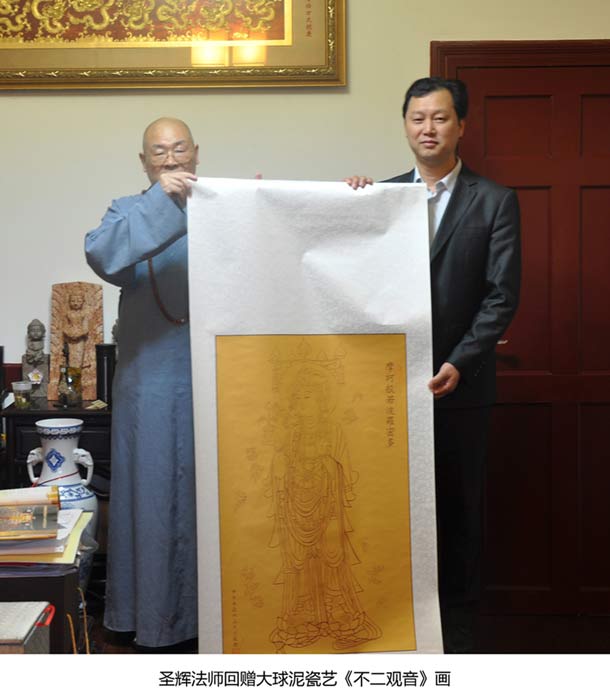 圣輝法師大贊《多寶佛》(釋迦牟尼佛瓷塑像)工藝精湛,表情細(xì)膩,是他見過的精致的瓷雕佛像。他說,大球泥瓷藝捐贈這么珍貴的佛像是在做大善事,塑造佛像、弘揚(yáng)佛法更是功德無量,與佛結(jié)緣的人都會一生平安。同時(shí),圣輝法師還將自己收藏的《不二觀音》畫回贈給大球泥瓷藝收藏。
