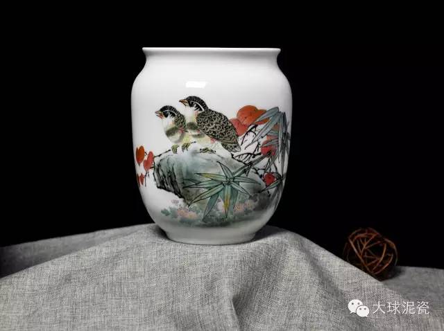 《安居樂業(yè)》冬瓜瓶,以紅葉、家雀為創(chuàng)作素材,畫面采用了中國畫的傳統(tǒng)繪畫風(fēng)格,因原材料大球泥的白度極高,加上釉色勻凈,潔潤如玉,整件陶瓷藝術(shù)品,以清新淡雅的色彩和獨(dú)特的畫面形式展現(xiàn)大球泥瓷的魅力之處。