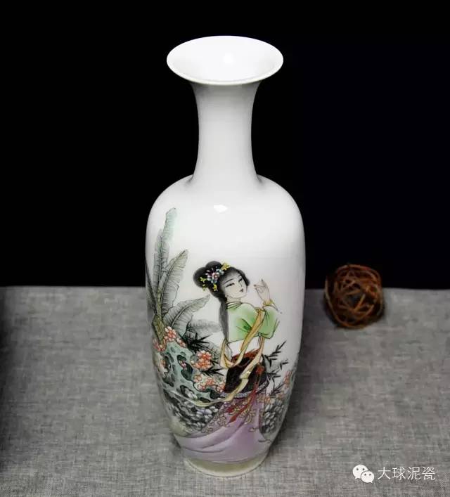 《如花似玉》柳葉瓶,以大球泥為主要材料,經(jīng)1400°C高溫?zé)贫。其瓶型設(shè)計(jì)精美、畫面端莊大方、瓷質(zhì)致密不漏,是珍貴的陶瓷藝術(shù)品!度缁ㄋ朴瘛妨~瓶,由高級(jí)工藝美術(shù)大師曾亞琴創(chuàng)作,器型撇口,短頸,豐肩,肩下削瘦至足,足內(nèi)凹。瓶身挺拔秀美,通體素凈,雍容中不失典雅,其氣韻之美,代表了大球泥瓷的制瓷技藝。