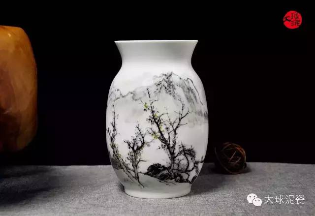 《江南春早》瓶,以大球泥為原材料,由工藝美術(shù)大師鄧劍波創(chuàng)作。作者繪畫出一場(chǎng)春雨后自然美景,山林錯(cuò)落有致,樹木生機(jī)勃勃,展現(xiàn)大自然的無(wú)限美麗風(fēng)光。