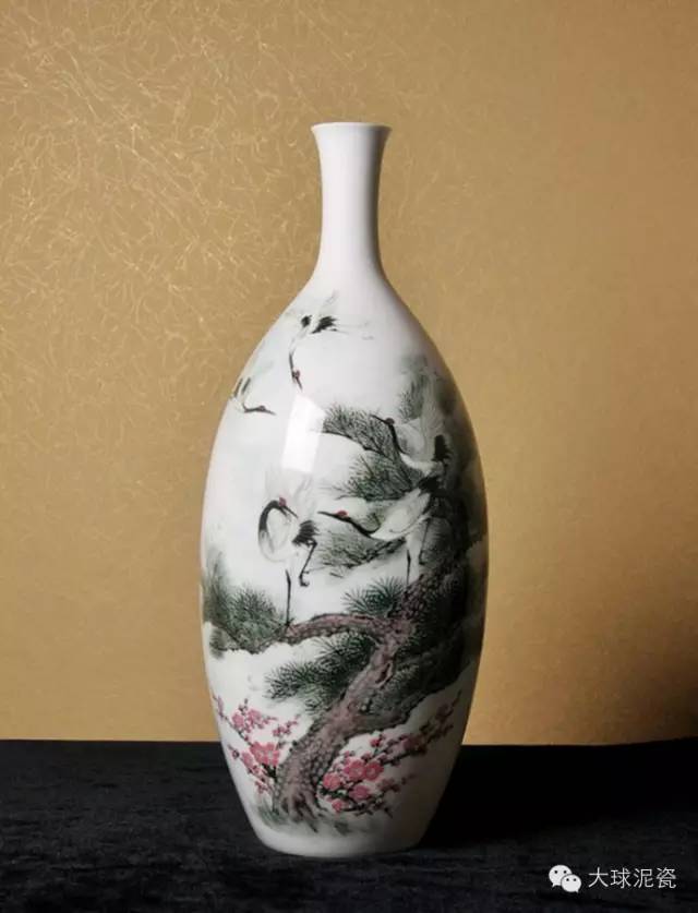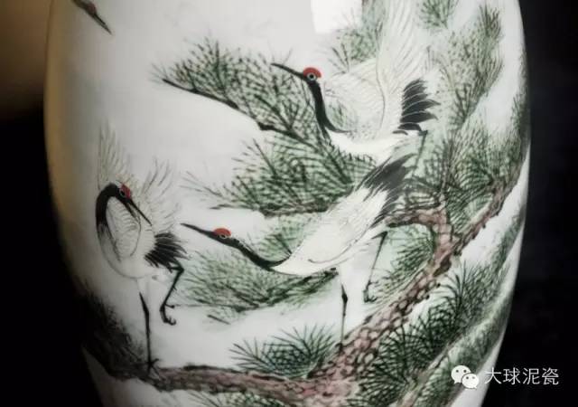 此《松鶴延年》瓶由藝美術(shù)大師孫新水先生(已故)于2005年創(chuàng)作,是其優(yōu)秀代表作品之一。采用釉下五彩的工藝,瓶高40cm,器型規(guī)整,肩、底略收,顯示出沉穩(wěn)大氣之風(fēng)。頸部拉長,堅(jiān)韌挺拔,提升了整個(gè)作品的氣勢和腔調(diào)。畫面中一枝勁松虬身宛轉(zhuǎn),松針茂密。枝干上立著三只仙鶴,神采飛揚(yáng),精神飽滿,栩栩如生。窈窕而的風(fēng)姿,宛若仙人?罩械膬芍幌生Q雙翅張開,自在從容地飛翔在天空中,目光如炬,直視前方,給人一種安定、祥和的感覺。松樹旁幾株梅花開放,顏色艷麗卻又不失雅致。整幅畫面呈現(xiàn)出一種靈活生動(dòng),淡妝濃抹總相宜的舒適感,讓人愛不釋手。