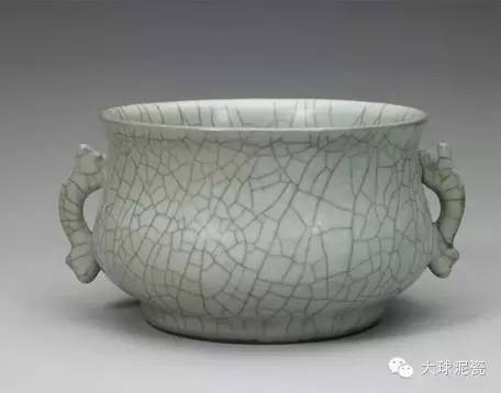 哥窯的主要特征是釉面有大大小小不規(guī)則的開(kāi)裂紋片,俗稱開(kāi)片文武片”,這是發(fā)生在釉面上的一種自然開(kāi)裂現(xiàn)象,原本是瓷器燒制中的缺陷,后來(lái)人們掌握了開(kāi)裂的規(guī)律,有意識(shí)地讓它產(chǎn)生開(kāi)片,從而形成了一種獨(dú)特的美感。細(xì)小如魚子的叫魚子紋,開(kāi)片呈弧形的叫蟹爪紋,開(kāi)片大小相同的叫百圾碎。