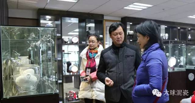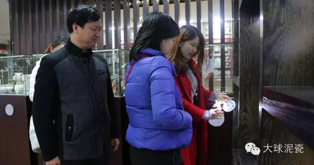 王主任首先參觀了大球泥瓷藝的精品展示廳,第一次見(jiàn)到大球泥瓷廬山真面目的王主任一走進(jìn)展廳,便被眾多光彩熠熠的作品吸引住了目光。她一邊仔細(xì)地觀賞每一件作品,一邊拿起手機(jī)興致勃勃地拍照,說(shuō)要把這么精美的瓷器發(fā)到朋友圈和好友們一起分享。