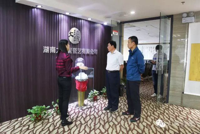 在公司工作人員陪同下,甘處長一行首先參觀了大球泥瓷精品展示廳,并詢問了大球泥原料的形成、發(fā)現(xiàn)、存量及大球泥瓷的特點(diǎn),對(duì)于大球泥瓷經(jīng)典作品做了仔細(xì)鑒賞。他建議,這么珍貴的作品,每一件都要做好版權(quán)登記,取得保護(hù),防止別人來仿冒、假冒大球泥作品。