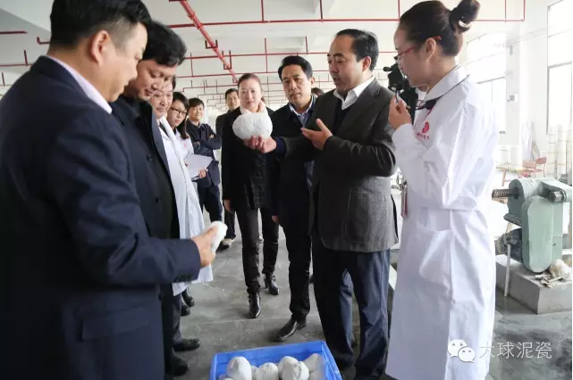 在公司董事長滕召華的陪同下,陽市長一行下車后直奔大球泥瓷生產(chǎn)、創(chuàng)作區(qū)。在大師創(chuàng)作室,陽市長詳細(xì)詢問了釉下彩的繪制工藝及創(chuàng)作靈感等,特別強(qiáng)調(diào)是否原創(chuàng)。來到練泥及制模區(qū),問到器型設(shè)計情況和大球泥原料的用量配方。陽市長對大球泥十分了解,他揀起一坨大球泥向隨行人員做起了解說:大球泥挖掘出來,就是雪白團(tuán)狀,是一種不可再生資源,現(xiàn)已枯竭。上個世紀(jì)因“毛瓷”而聲名遠(yuǎn)揚(yáng),有著厚重的歷史底蘊(yùn)。目前僅存于世的百余噸大球泥都被滕召華搶救性保護(hù)起來了,現(xiàn)在是用一坨少一坨!