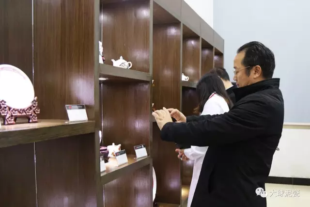 精品展廳內(nèi),聶方紅部長(zhǎng)對(duì)精細(xì)雅致、潤(rùn)白通透的大球泥瓷嘖嘖稱贊,并拿出相機(jī)拍下眾多美輪美奐的作品。