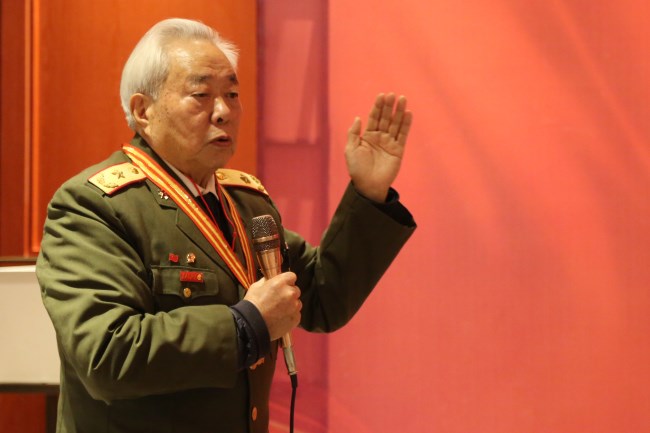 黃祖示將軍是兩彈一星的功勛,在部隊(duì)期間,年年被評為五好戰(zhàn)士,并被毛澤東主席親自接見。他感慨道,開國元勛們是人民的大救星,沒有老一輩的浴血奮斗就沒有新中國。動情之處,黃祖示將軍起身高歌——“東方紅,太陽升……”現(xiàn)場人員隨聲合唱,掌聲雷動。