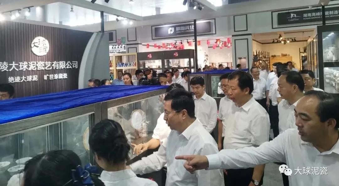 是日下午,考察團(tuán)到達(dá)醴陵國(guó)際會(huì)展中心,在醴陵市委書記胡湘之引領(lǐng)下參觀了3號(hào)館里的大球泥瓷展示廳,觀賞了大球泥瓷的百余件珍品。其中《和平》套具、《紅太陽(yáng)》偉人浮雕、《為人民服務(wù)》等作品,受到了領(lǐng)導(dǎo)們的高度贊賞。