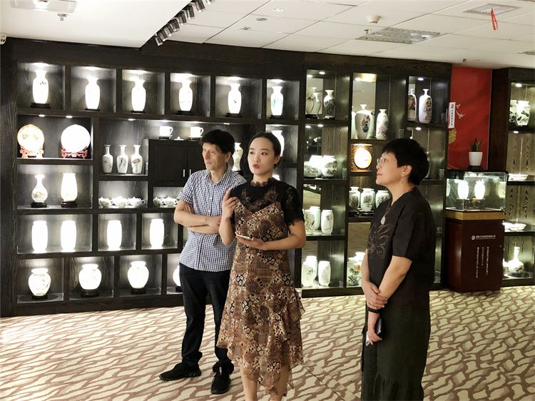 譚副書記一行走進(jìn)展廳,就被精美的大球泥瓷瞬間吸引了眼球!斑@些作品靜謐中藏有靈動,厚重中蘊(yùn)含毓秀,飄逸中攜帶雄渾”,“瓷胎溫潤、留白巧妙、意境宏闊”,“《幸福人家》大壺題款好、寓意深”,“《千秋偉業(yè)》浮雕生動感人、催人奮進(jìn)”,藝術(shù)家們一邊在品鑒一邊在感言。段教授說“大球泥這種絕世好材料,只適合做高端藝術(shù)陶瓷,要堅持做藝術(shù)大家的精品,要把好鋼都用在刀刃上!睖敝飨贿呌檬謾C(jī)拍攝一邊發(fā)呼感慨“‘形而上者謂之道,形而下者謂之器’,器物之美,終歸于心。我感受到大球泥瓷藝是一家有匠心、有溫度、有情懷的企業(yè),希望能堅守初心,創(chuàng)作出更多美感與底蘊(yùn)兼具的好作品!