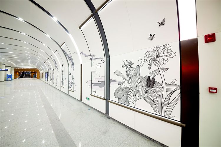 十里河站通過營造國畫的意境,采用現(xiàn)代工藝方式,體現(xiàn)十里河傳統(tǒng)的古玩文化及現(xiàn)代轉(zhuǎn)型升級。將地鐵空間與周邊文化特色結(jié)合,用瓷器、白描、剪紙、掐絲等組合方式,創(chuàng)作出了《十里河·國畫意境》、《十里河·古趣風(fēng)采》《十里河·方寸之間》、《十里河·魚貫而入》四個篇章,將“十里長河”的“古意古韻”娓娓道來。