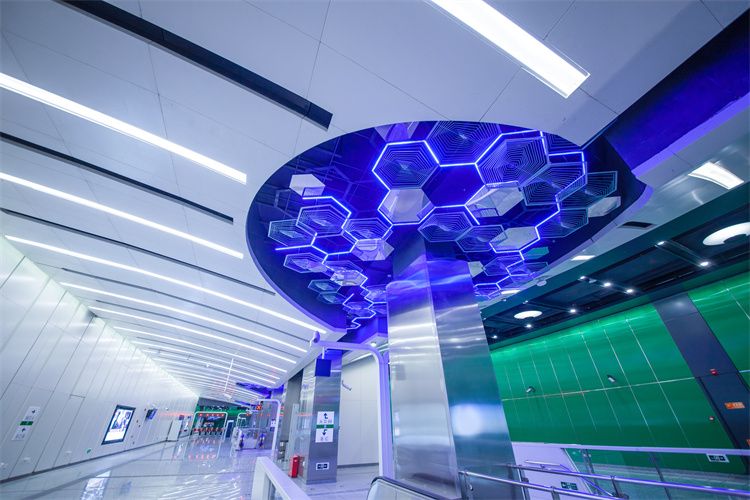 北神樹站則圍繞“智慧之樹”的主題進行延伸,將北神“樹”與“生物醫(yī)藥符號(六邊形)”進行藝術(shù)化組合,用流動藝術(shù)燈光和六邊形交織穿插,有序無形相結(jié)合,寓意生物科技有序發(fā)展,展現(xiàn)生物科技神秘力量。通過移動年輪、生物指紋、流動漣漪等形式,描述生命演變、生生不息。讓乘客觸摸現(xiàn)代科技感,體驗生命流動感,回味人生變化感。