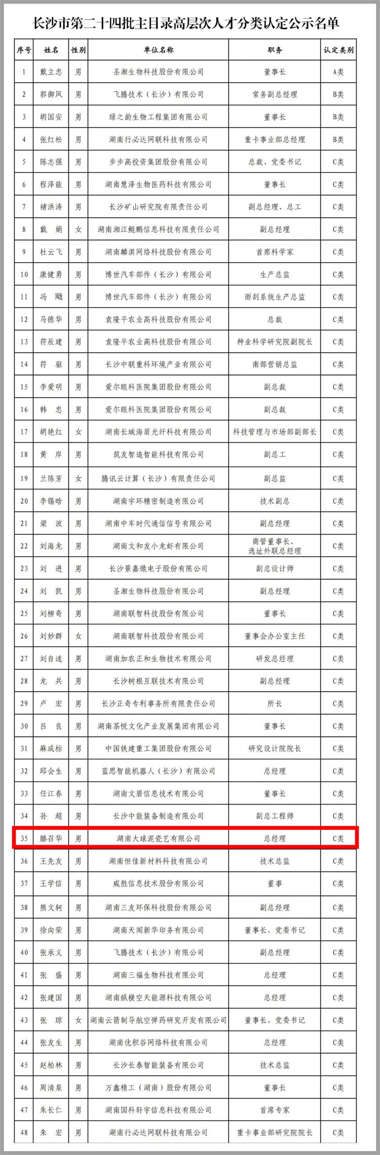 日前,根據(jù)中共長(zhǎng)沙市委人才工作領(lǐng)導(dǎo)小組《關(guān)于印發(fā)<2021年度長(zhǎng)沙市高層次人才分類(lèi)認(rèn)定目錄>的通知》(長(zhǎng)人才發(fā)〔2021〕1號(hào))文件公告,公司董事長(zhǎng)滕召華正式被認(rèn)定為長(zhǎng)沙市第二十四批高層次人才。