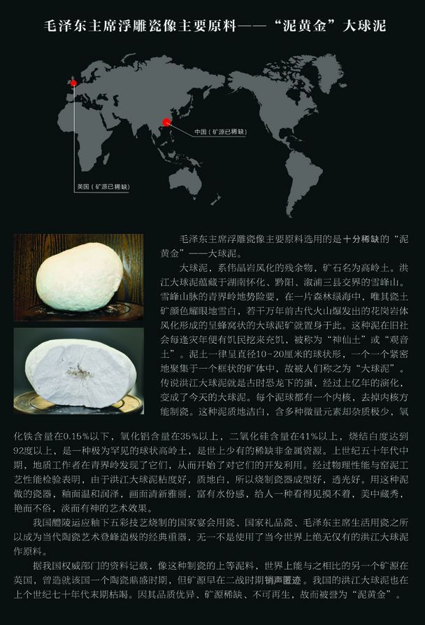 大球泥是偉晶巖風(fēng)化物,雪白球狀體,形似恐龍蛋;含鋁量極高,含鐵量極少,是制作陶瓷的稀缺原料。至今世界只發(fā)現(xiàn)兩個(gè)礦源,一個(gè)是英國(guó),二戰(zhàn)時(shí)枯竭;一個(gè)是湖南雪峰山,上世紀(jì)八十年代枯竭,F(xiàn)存于世就一百多 噸,絕大部分被大球泥瓷藝公司搶救性保護(hù)收藏,并審慎研究、開發(fā)、利用。